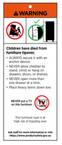 - training your staff to be ready to advise consumers of the risks of toppling furniture and how to safely secure the furniture