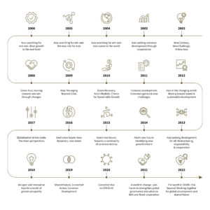 To glance at the themes over the past two decades is to journey through shifts in the global economy and Asia’s evolving place; from a focus on a ‘new Century’ in 2002, to the familiar-sounding ‘Green Recovery’ in 2010 and a focus on a ‘Covid-19 world’ in 2022.