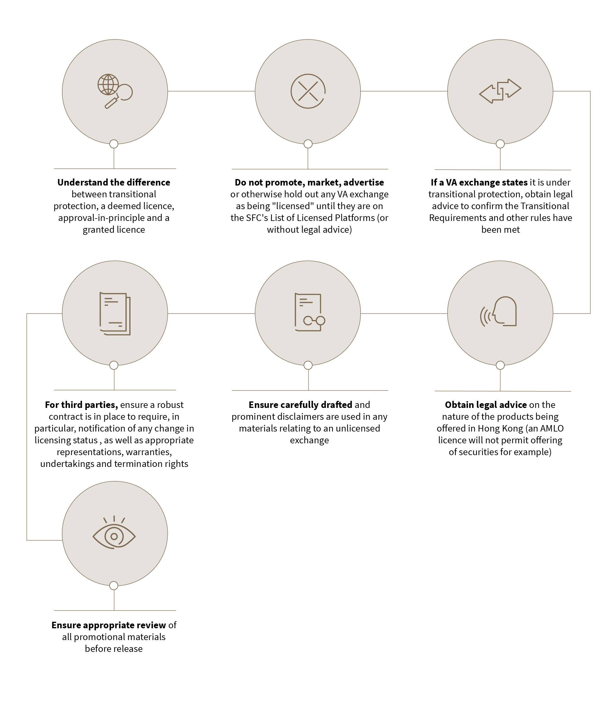 Advertising, or referring clients to, a VA exchange under transitional protection is a thorny area. It is not as simple as checking a register – there are multiple (subjective) assessments that need to be made. The practical effect is that being under the transitional protection is not quite the same as holding an SFC licence, meaning partnerships, banking relationships and advertising arrangements require care. In addition, the transition protection provisions in the AMLO only refer to a VA exchange that benefits from the protection of not contravening the requirement to hold a licence – it is otherwise silent in relation to the advertising ban on unlicensed VA exchanges.