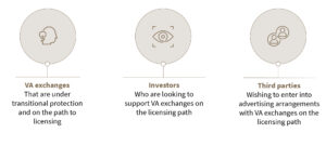 The key dates of relevance here are those that relate to what is known as the “transitional protection”, whereby a VA exchange will be under transitional protection until 1 June 2024 (or its licence is approved, rejected or withdrawn) provided that: