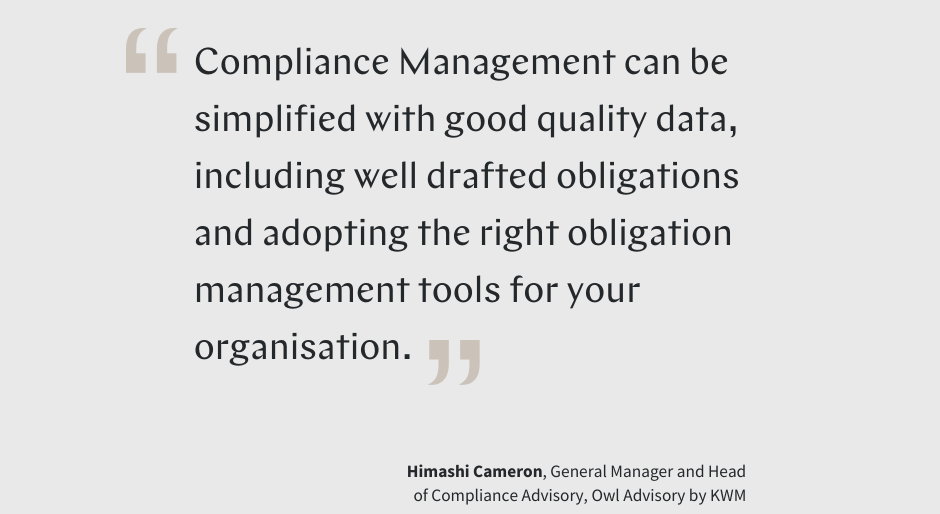 Have you met Owl Advisory by KWM? Owl Advisory is uniquely placed to help you understand your compliance obligations and help many of our clients to create or uplift their obligations register.