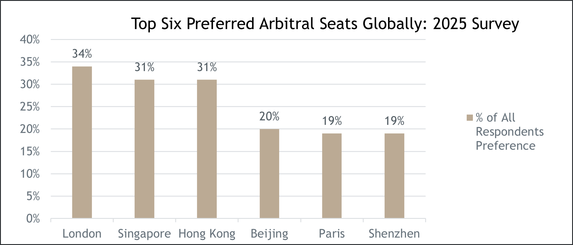 Notably Shenzhen replaced Paris in the top five seat preferences for Asia Pacific in the 2025 Survey, as compared to the 2021 Survey.[7] The figures in the 2025 Survey reflect the growing influence of Mainland China arbitration centres, with Hong Kong also overtaking Singapore as the top preference among Asia Pacific users.