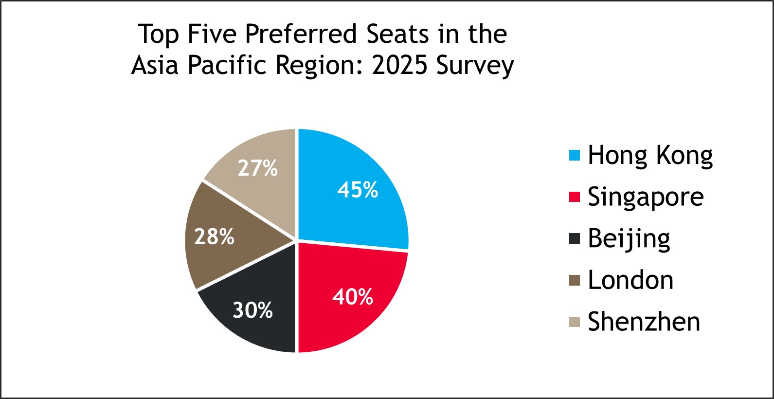 Taking an Asia Pacific focus, i.e. on survey respondents primarily practising in the Asia Pacific, the 2025 Survey revealed a nuanced approach within the region with Hong Kong (45%) as the most preferred seat, closely followed by Singapore (40%), Beijing (30%), London (28%) and Shenzhen (27%) to complete the top five (5) seat preferences. See below Diagram 2.