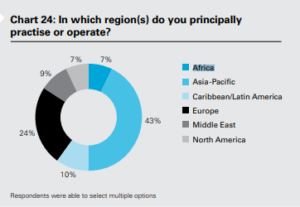 1. The Age of Asian Arbitration is well and truly upon us. In this year’s Survey, 43% of Survey respondents stated that they principally operate in Asia-Pacific.  This is up from 25% in 2018.  This is the largest portion of the pie by a significant margin: